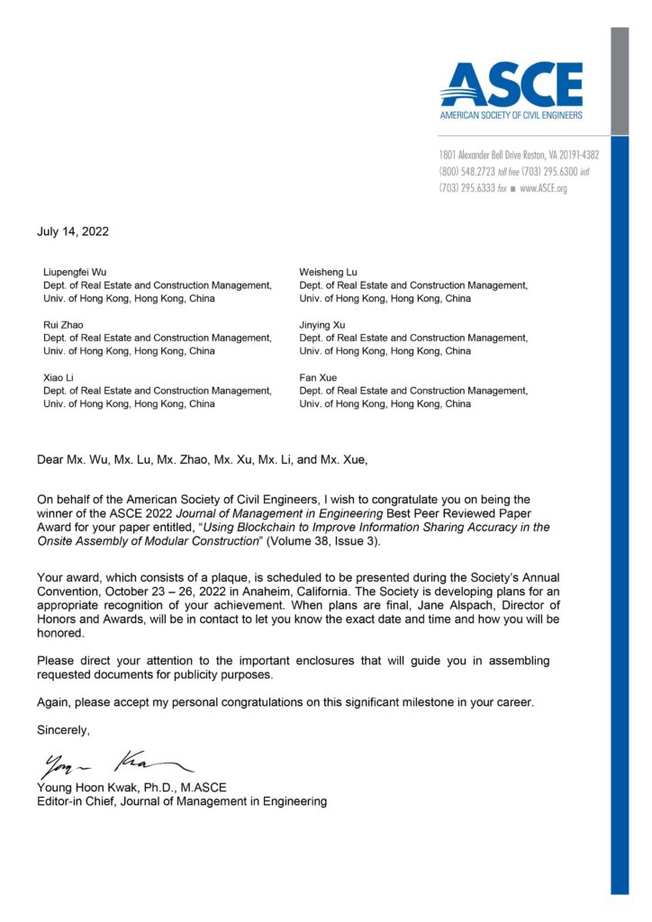 - Lu, W., Wu, L*., Zhao, R., Li, X., & Xue, F. (2021). Blockchain technology for governmental supervision of construction work: learning from digital currency electronic payment systems. Journal of Construction Engineering and Management, 147(10), 04021122. https://doi.org/10.1061/(ASCE)CO.1943-7862.0002148
