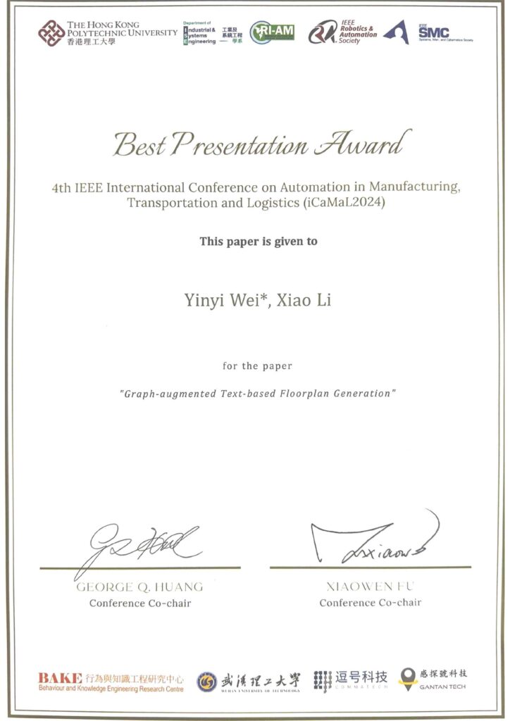- Wei, Y.△, & Li, X.* (2024, August). Graph-Augmented Text-Based Floorplan Generation. In 2024 International Conference on Automation in Manufacturing, Transportation and Logistics (ICaMaL) (pp. 1-9). IEEE.
