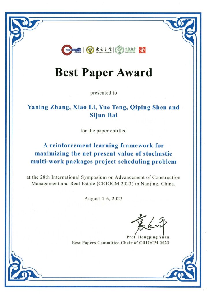 - Zhang, Y.△, Li, X.*, Teng, Y., Shen, Q., & Bai, S. (2023, August). A Reinforcement Learning Framework for Maximizing the Net Present Value of Stochastic Multi-work Packages Project Scheduling Problem. In International Symposium on Advancement of Construction Management and Real Estate (pp. 733-756). Singapore: Springer Nature Singapore.