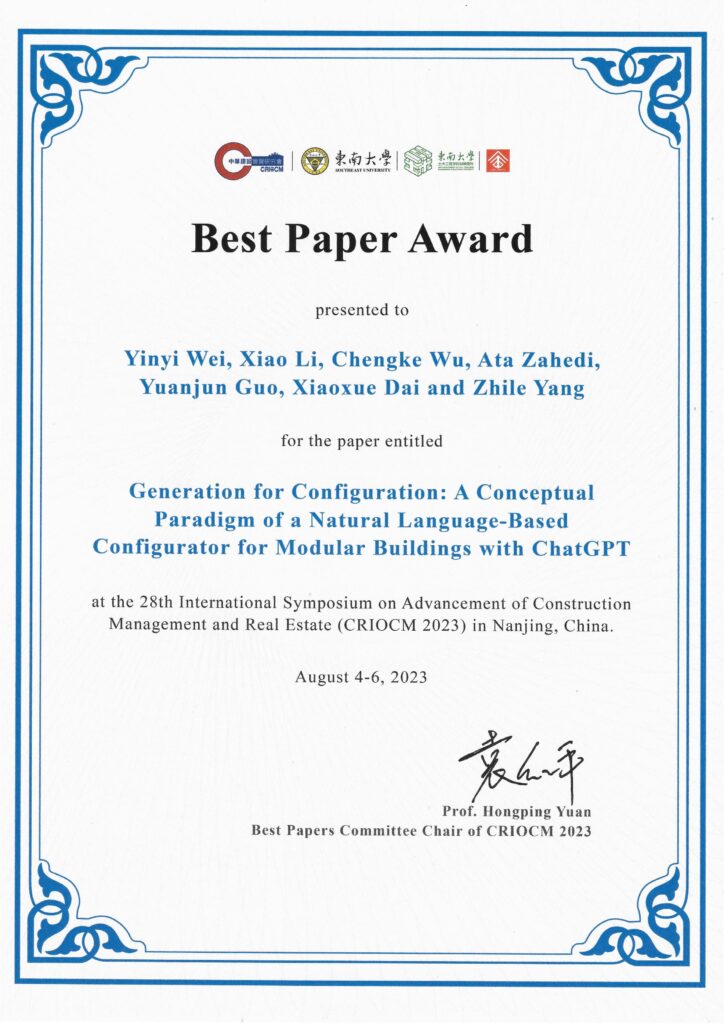 - Wei, Y.△, Li, X.*, Wu, C., Zahedi, A., Guo, Y., & Yang, Z. (2023, August). Generation for Configuration: A Conceptual Paradigm of a Natural Language-Based Configurator for Modular Buildings with ChatGPT. In International Symposium on Advancement of Construction Management and Real Estate (pp. 1491-1501). Singapore: Springer Nature Singapore.