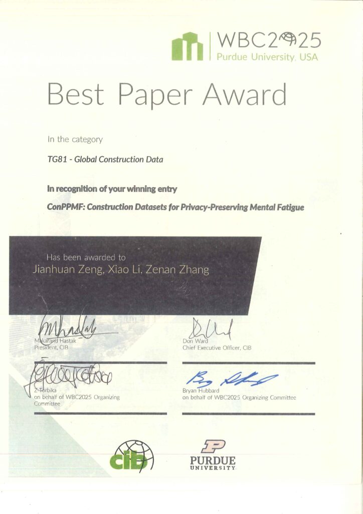 - Zeng, J. △, Li, X.*, & Antwi-Afari, M. F. (2025). Federated Smart Work Package Framework with Triplet Loss for Mental Fatigue Monitoring. Journal of Computing in Civil Engineering, 39(6), 04025102. https://doi.org/10.1061/JCCEE5.CPENG-6507