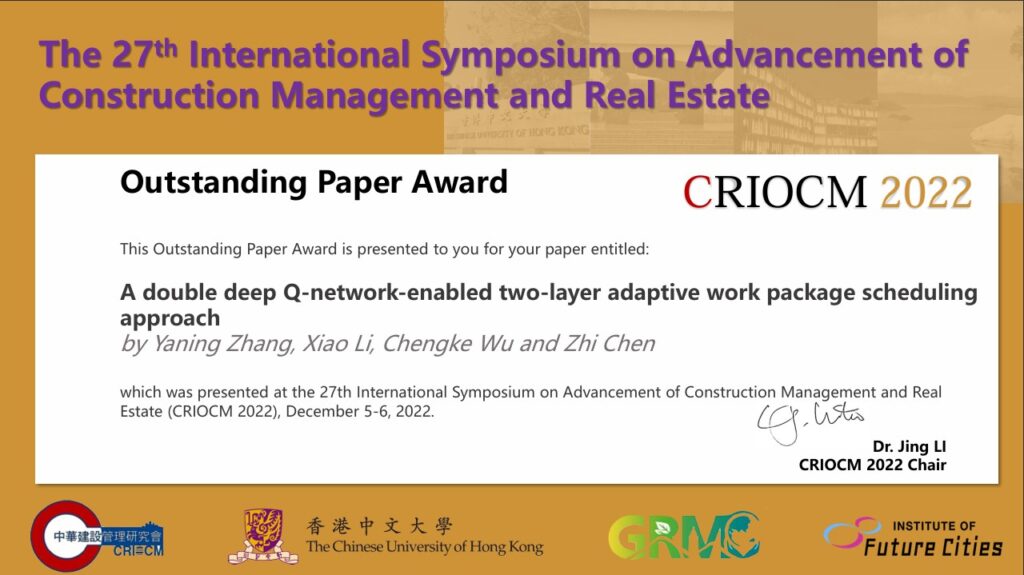 - Zhang, Y.△, Li, X.*, Wu, C., & Chen, Z. (2022, December). A Double Deep Q-Network-Enabled Two-Layer Adaptive Work Package Scheduling Approach. In International Symposium on Advancement of Construction Management and Real Estate (pp. 1027-1041). Singapore: Springer Nature Singapore.