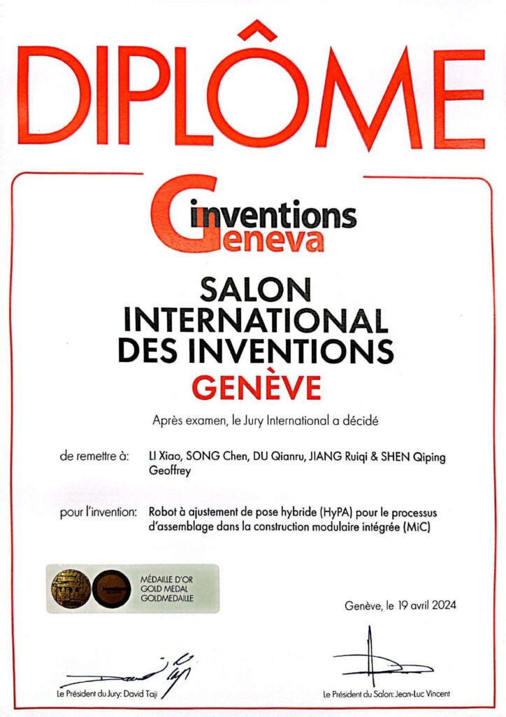- Song, C.#, Li, X.*, Du, Q., Jiang, R., & Shen, Q. (2024). Hybrid pose adjustment (HyPA) robot design for prefabricated module control in modular construction assembly. Automation in Construction, 168, 105798. https://doi.org/10.1016/j.autcon.2024.105798