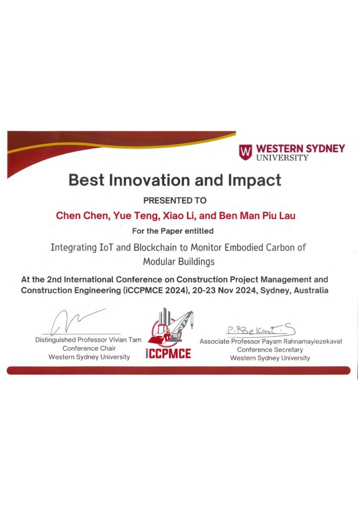 - Wang, J.△, & Li, X.* (2023). A Novel Incentive Mechanism for Blockchain-based Carbon Emission Reduction in Construction. Construction Blockchain Conference 2023: Blockchain & IoT. Hong Kong